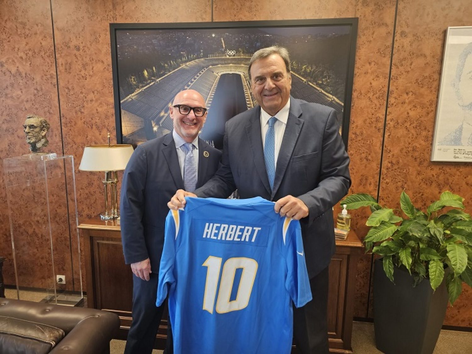 Στο τέλος της συνάντησης ο Fred Maas έδωσε συμβολικά στον κ. Κούβελο ως αναμνηστικό δώρο, τη φανέλα των LA Chargers με τον αριθμό 10 που φορά ο καλύτερος παίκτης της ομάδας, ο Justin Herbert.