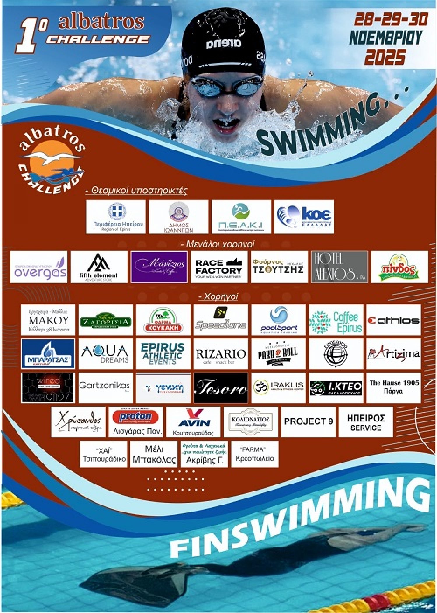 Ο Albatros Ιωαννίνων ανακοινώνει την διοργάνωση των αγώνων κλασικής και τεχνικής κολύμβησης, με την ονομασία Albatros Challenge 2025, που θα πραγματοποιηθούν στις 28-29-30/Νοεμβρίου 2025 στο Π.Ε.Α.Κ. Ιωαννίνων.