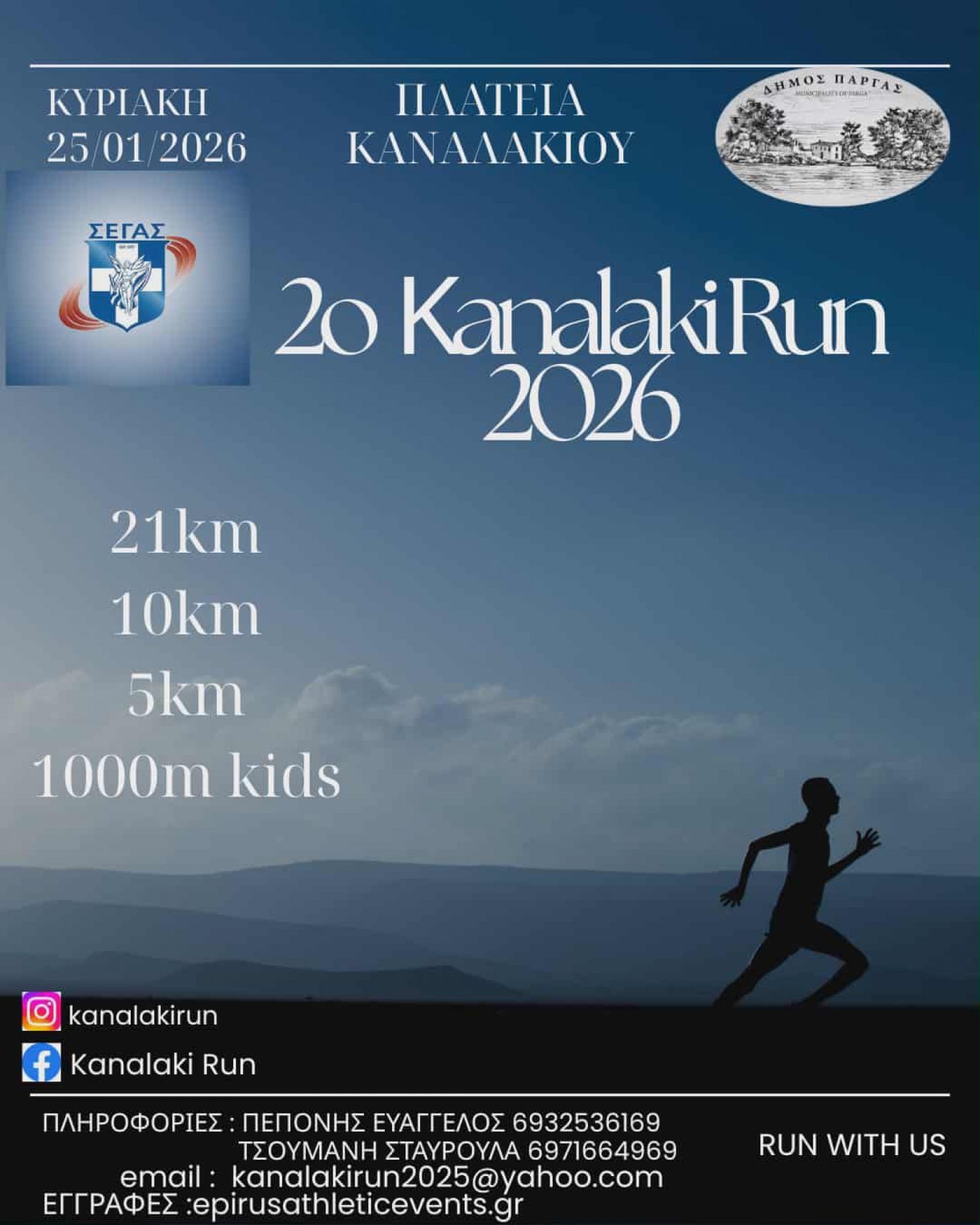 Τη διεξαγωγή του 2ου Kanalaki Run, ανακοινώνει ο Δήμος Πάργας που θα πραγματοποιηθεί σε συνεργασία με τον ΣΕΓΑΣ την Κυριακή 25 Ιανουαρίου και με αφετηρία την Πλατεία Καναλακίου.