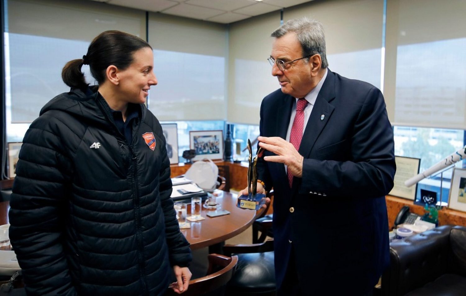 Στη συνέχεια ο Πρόεδρος της ΕΟΕ ανέλυσε στην αθλήτρια του βόλεϊ το πρόγραμμα «Υιοθετήστε έναν Αθλητή» που έχει δημιουργήσει η Ελληνική Ολυμπιακή Επιτροπή. «Στο πρόγραμμα θέλουμε να εντάξουμε 220 άτομα μέχρι τους Ολυμπιακούς Αγώνες του Λος Αντζελες, ασχέτως εάν τελικά προκριθούν. Από την 1η Ιανουαρίου ξεκίνησε το πρόγραμμα στήριξης στους πρώτους 74 αθλητές και αθλήτριες και θα φτάσουμε στους 220, δηλαδή στο σύνολο της Προολυμπιακής Ομάδας, ώστε όλοι τα μέλη της, να επικεντρωθούν απερίσπαστα στις προπονήσεις και την προετοιμασία τους. Έχει ιδιαίτερη σημασία να προκριθούν πολλοί αθλητές, γιατί η πρόκριση έχει την ίδια αξία με το να πάρεις μετάλλιο, λόγω της δυσκολίας της και των θυσιών που απαιτούνται».