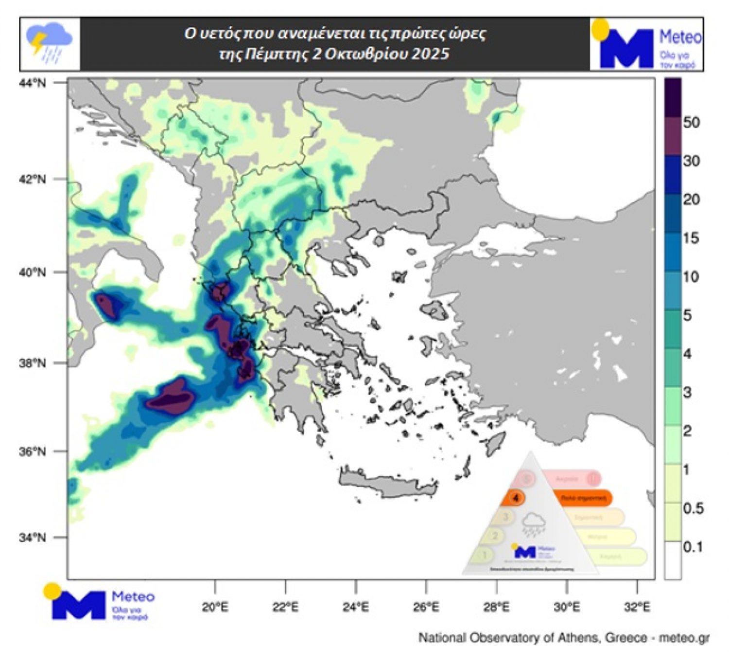 Πιο αναλυτικά, από το βράδυ της Τετάρτης 01/10 βροχές και καταιγίδες αναμένονται στο Ιόνιο. Από τις πρώτες ώρες της Πέμπτης 02/10 τα φαινόμενα θα επεκταθούν και στα ηπειρωτικά, με εξαίρεση την Ανατολική Μακεδονία και Θράκη. Η Ανατολική Μακεδονία και Θράκη, το Βόρειο Αιγαίο, οι Κυκλάδες και η Κρήτη αναμένεται να επηρεαστούν από το μεσημέρι της Πέμπτης 02/10. Τα φαινόμενα θα είναι κατά τόπους ισχυρά στο Ιόνιο και στα δυτικά ηπειρωτικά έως το απόγευμα της Πέμπτης 02/10, στην Πελοπόννησο από τις πρώτες ώρες έως και τις βραδινές ώρες της Πέμπτης 02/10 και στην Ανατολική Στερεά, σε τμήματα της Κεντρικής και Ανατολικής Μακεδονίας, στο Βόρειο Αιγαίο και στην Κρήτη από το απόγευμα της Πέμπτης 02/10. Στους χάρτες που ακολουθούν παρουσιάζεται ο υετός που αναμένεται (1) τις πρώτες ώρες, (2) το πρωί και (3) τις πρώτες βραδινές ώρες της Πέμπτης 02/10.