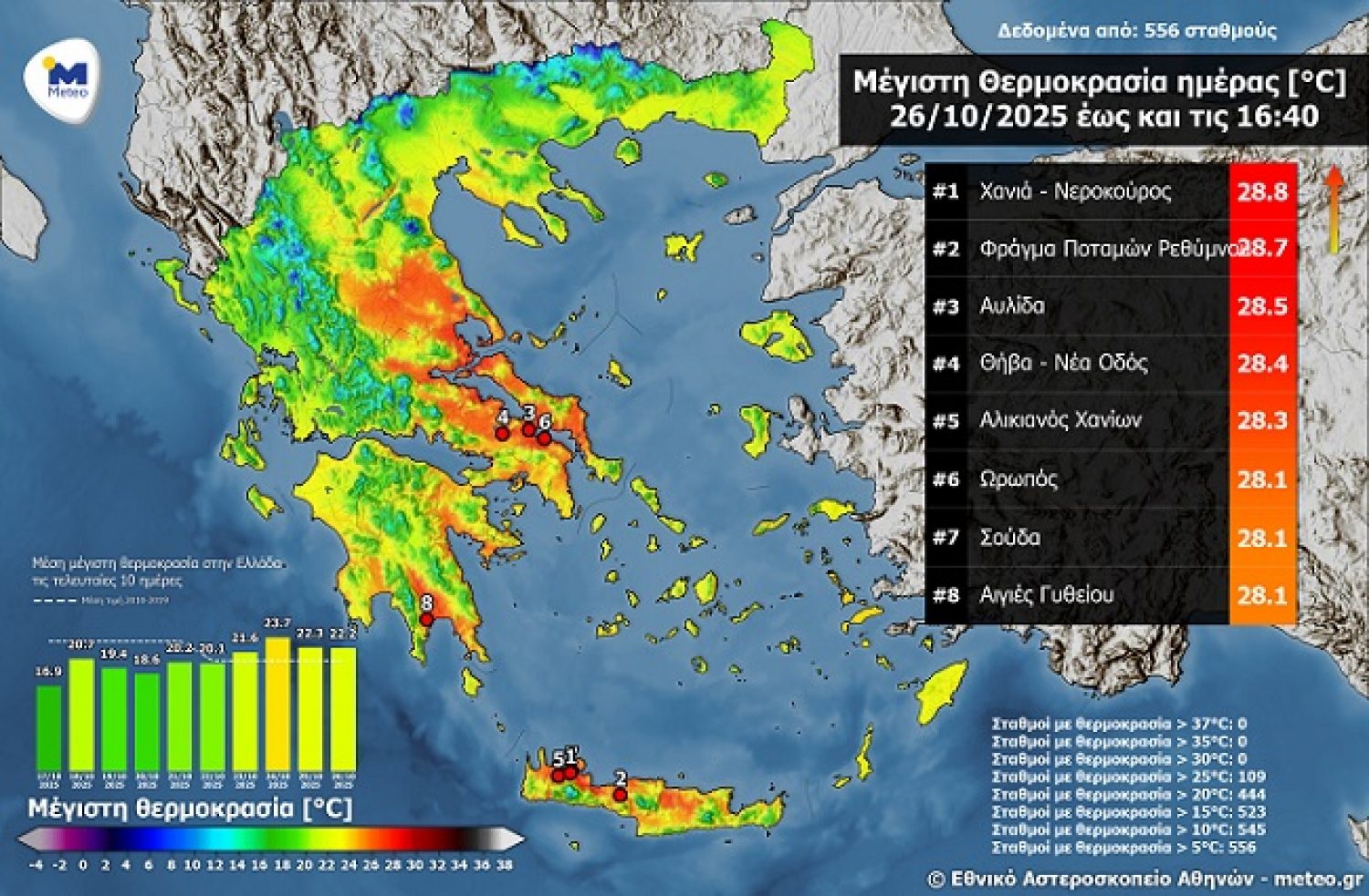 Πιο συγκεκριμένα, ο μετεωρολογικός σταθμός Νεροκούρου Χανίων κατέγραψε θερμοκρασία 28.8 °C.