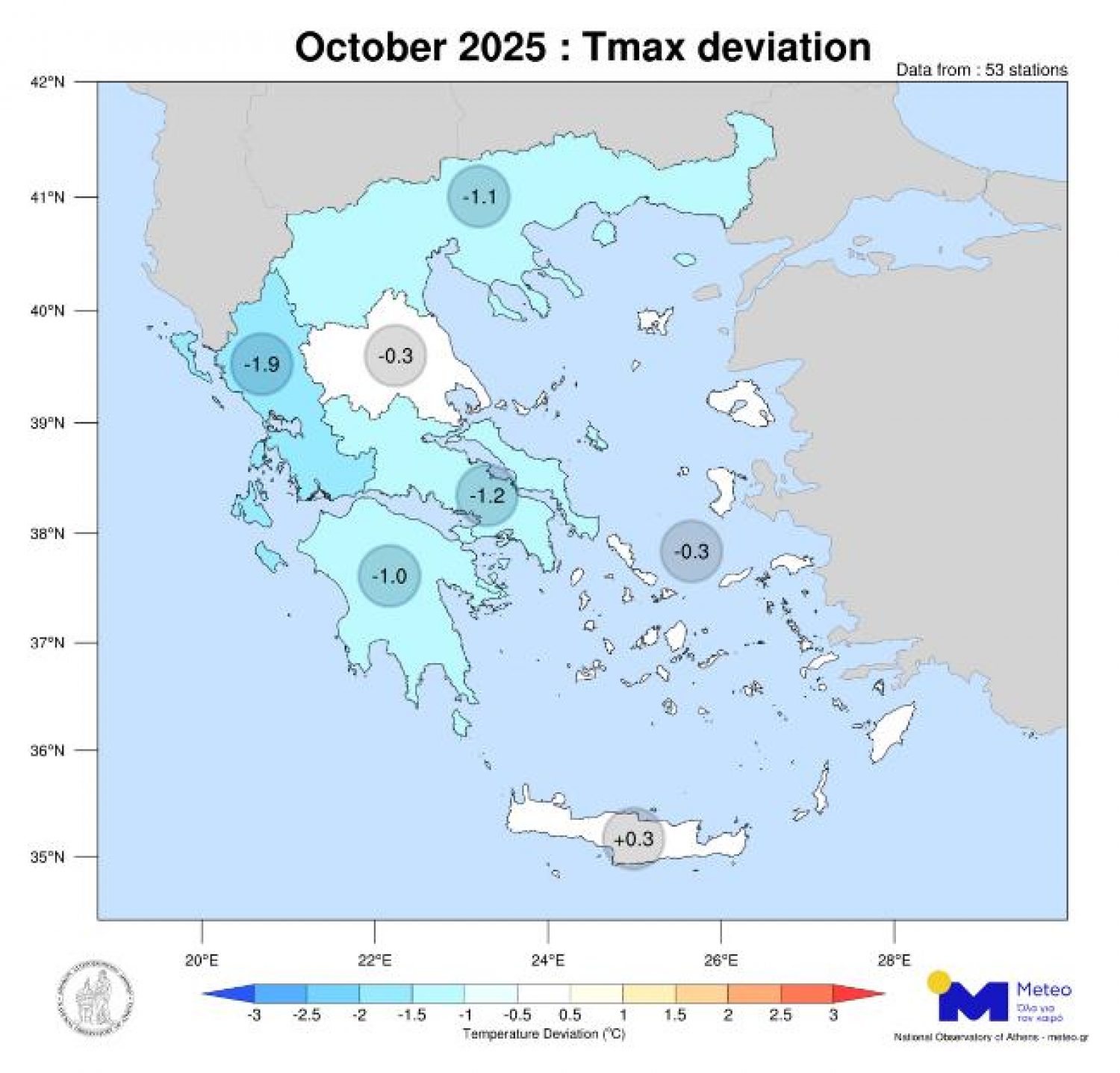 Σύμφωνα με το δίκτυο των 53 μετεωρολογικών σταθμών του meteo.gr του Εθνικού Αστεροσκοπείου Αθηνών (Ε.Α.Α), τον Οκτώβριο του 2025 η μέση τιμή των μεγίστων ημερήσιων θερμοκρασιών κυμάνθηκε κάτω από τα κανονικά για την εποχή επίπεδα σε όλες τις περιοχές της χώρας εκτός από την Κρήτη (σε σχέση με τον μέσο όρο της περιόδου 2010-2019).