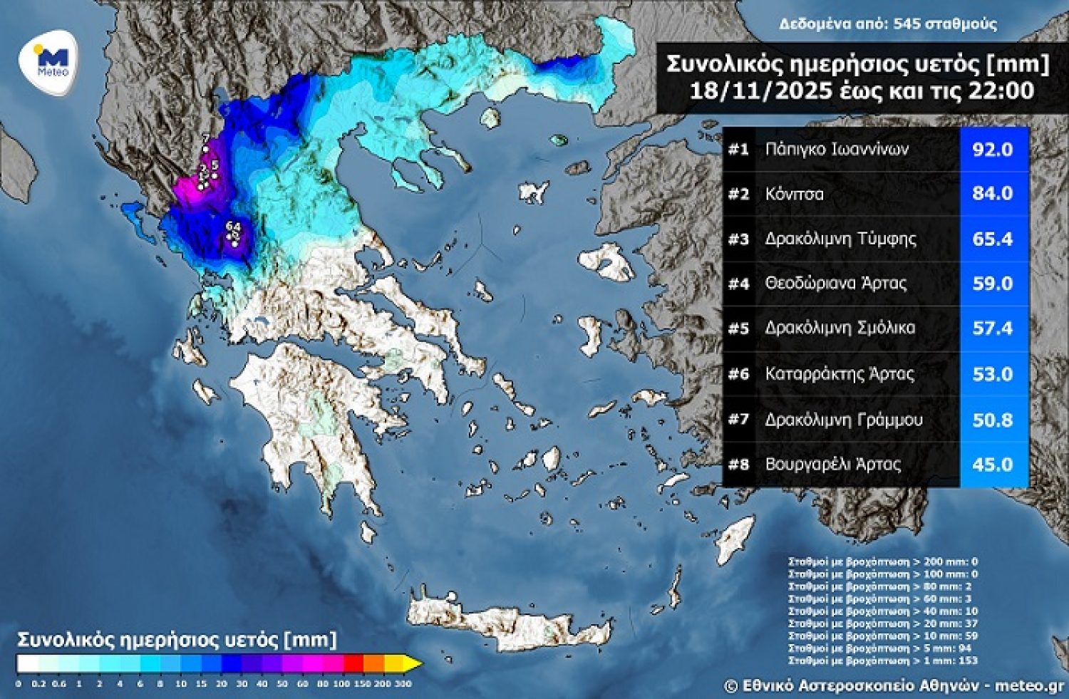 Σύμφωνα με δίκτυο αυτόματων μετεωρολογικών σταθμών του Εθνικού Αστεροσκοπείου Αθηνών / Meteo.gr τα μεγαλύτερα ύψη βροχής καταγράφηκαν στην Ήπειρο, όπως αποτυπώνεται στη χρωματική κλίματα του χάρτη, με το μεγαλύτερο ύψος βροχής μέχρι και τις 22:00 ώρα Ελλάδας να καταγράφεται στο Πάπιγκο Ιωαννίνων με 92.0 mm.