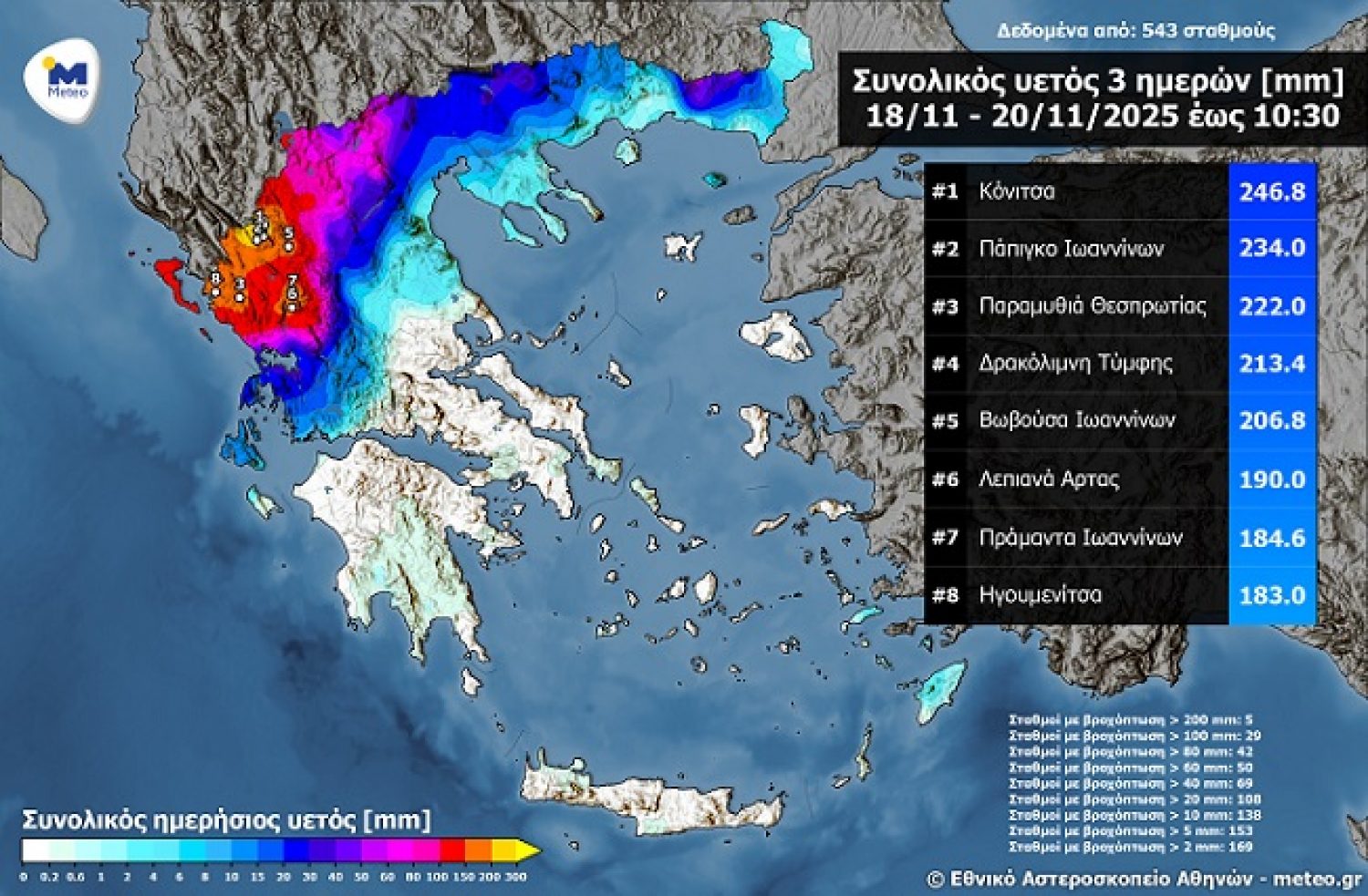 Όπως χαρακτηριστικά φαίνεται στον χάρτη της σχετικής εικόνας, ο αθροιστικός υετός από την αρχή της Τρίτης 18/11 έως τις 10:30 της Πέμπτης 20/11 ξεπέρασε κατά τόπους τα 200 χιλιοστά σε ορεινές περιοχές της Ηπείρου ενώ σε τμήματα της Θεσσαλίας, της Στερεάς, της Πελοποννήσου, της Εύβοιας, της Κρήτης και των νησιών του Αιγαίου δεν καταγράφηκε βροχόπτωση.