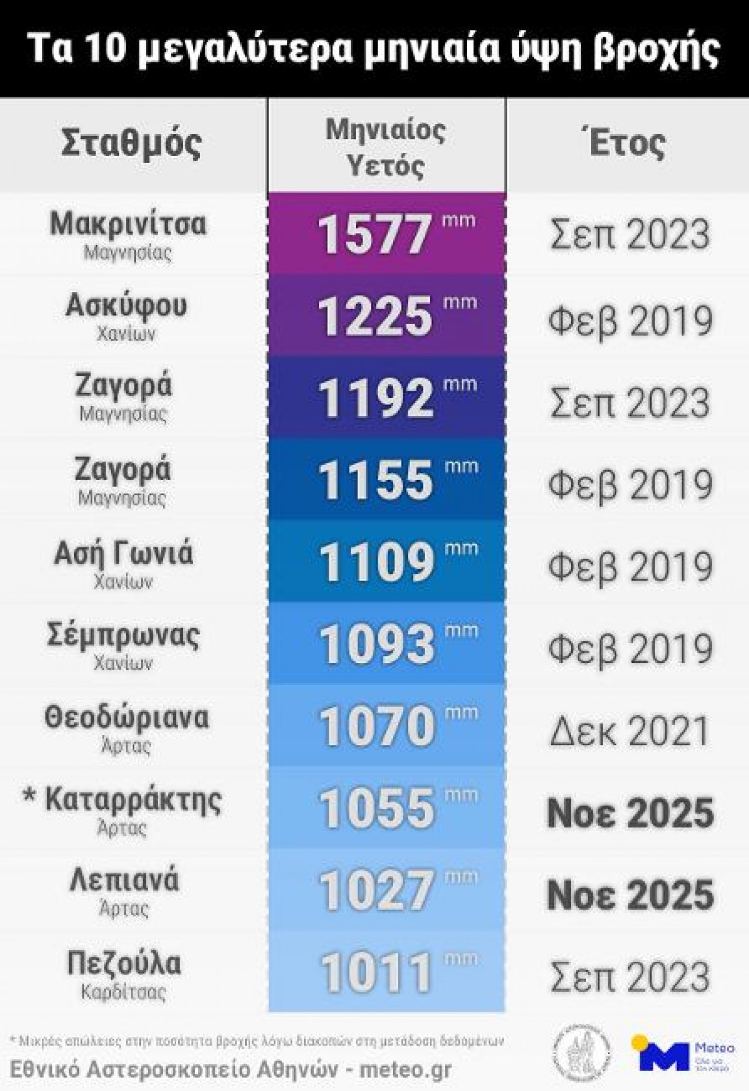 Τα δέκα μεγαλύτερα μηνιαία ύψη βροχής εμφανίζονται κυρίως σε τρεις περιόδους με έντονα καιρικά φαινόμενα: τον Φεβρουάριο 2019 (κακοκαιρίες Χιόνη και Ωκεανίς), τον Σεπτέμβριο 2023 (κακοκαιρίες Daniel και Ηλίας) και τον Νοέμβριο 2025 (κακοκαιρία Adel).