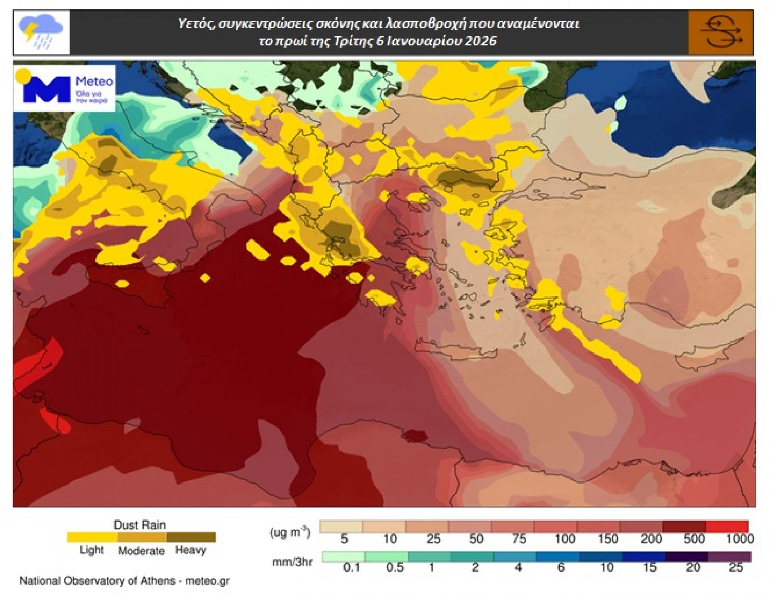 Η κατάσταση στη χώρα μας, σε ότι αφορά τους ανέμους στην μέση και κατώτερη τροπόσφαιρα, δεν αναμένεται να αλλάξει σημαντικά έως την Πέμπτη 08/01. Αποτέλεσμα είναι οι αυξημένες συγκεντρώσεις Αφρικάνικής σκόνης στην ατμόσφαιρα και κατά συνέπεια η εκδήλωση λασποβροχών κατά τόπους.