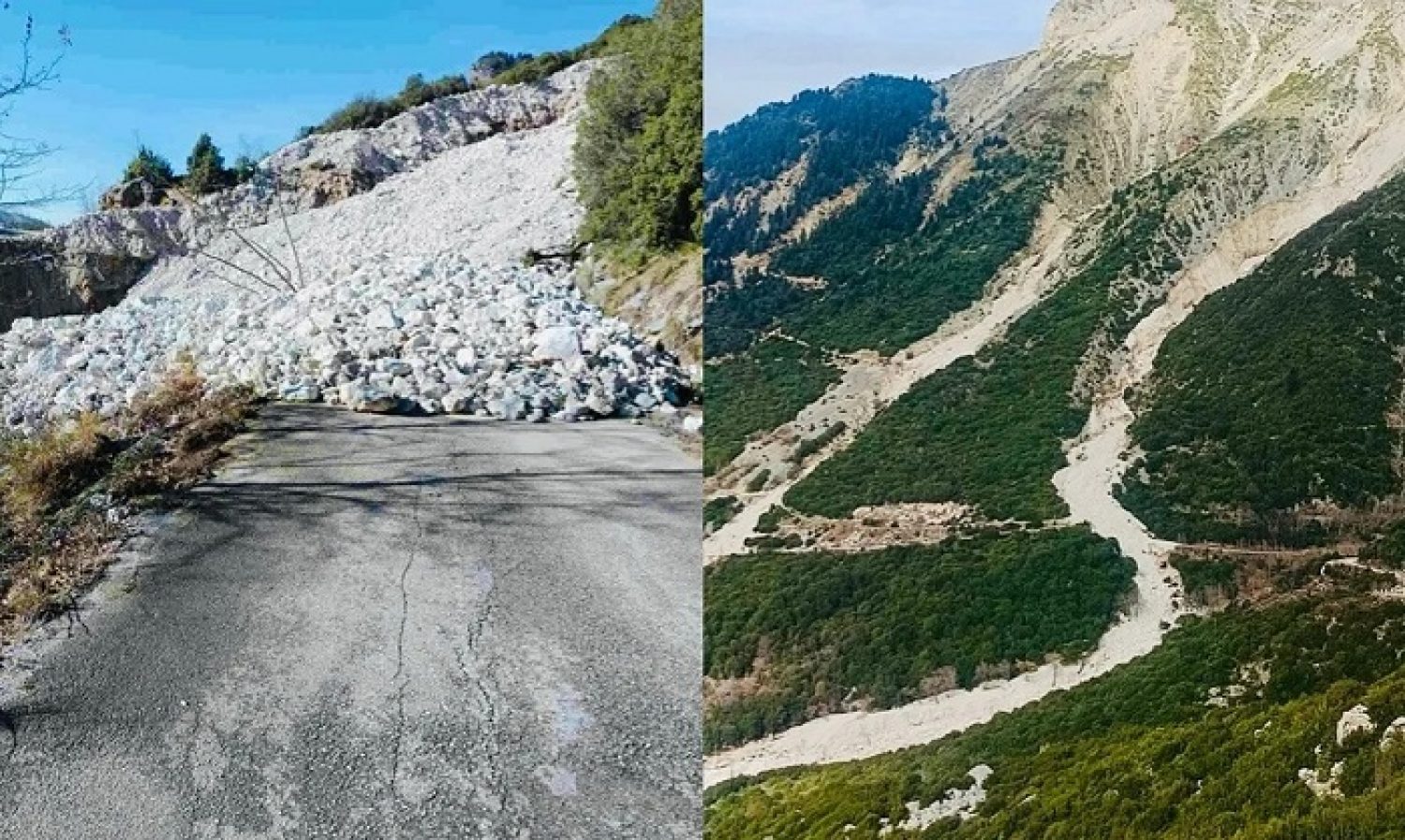 Το βουνό κατέβασε τεράστιους όγκους βράχων και πέτρες πάνω στον κεντρικό δρόμο, καθιστώντας τη διέλευση αδύνατη. Η εικόνα μοιάζει πραγματικά με έναν τεράστιο ποτάμι που αντί για νερό κατεβάζει μόνο πέτρες.