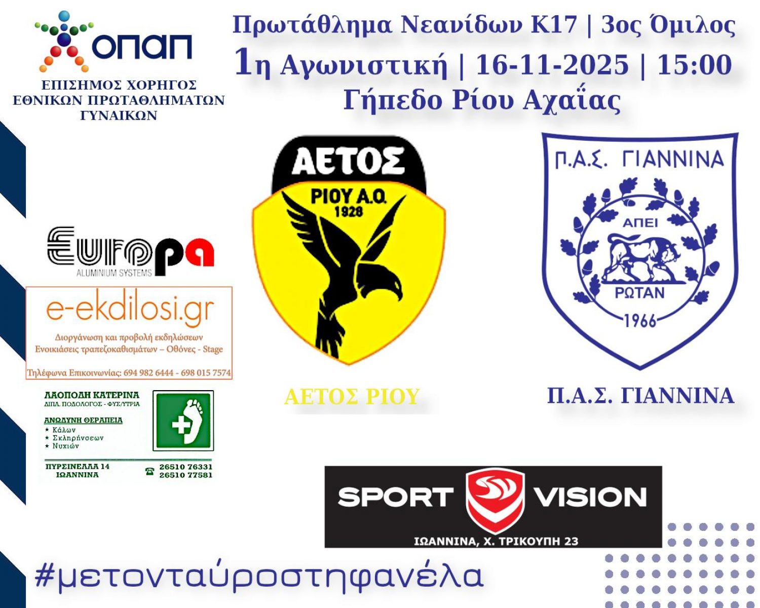 Οι Νεάνιδες, Κ17 του Π.Α.Σ. ΓΙΑΝΝΙΝΑ, αγωνίζονται για την 1η αγωνιστική του Πανελλήνιου Πρωταθλήματος Νεανίδων της ΕΠΟ, στην Πάτρα, απέναντι στην αντίστοιχη του Αετού Ρίου.