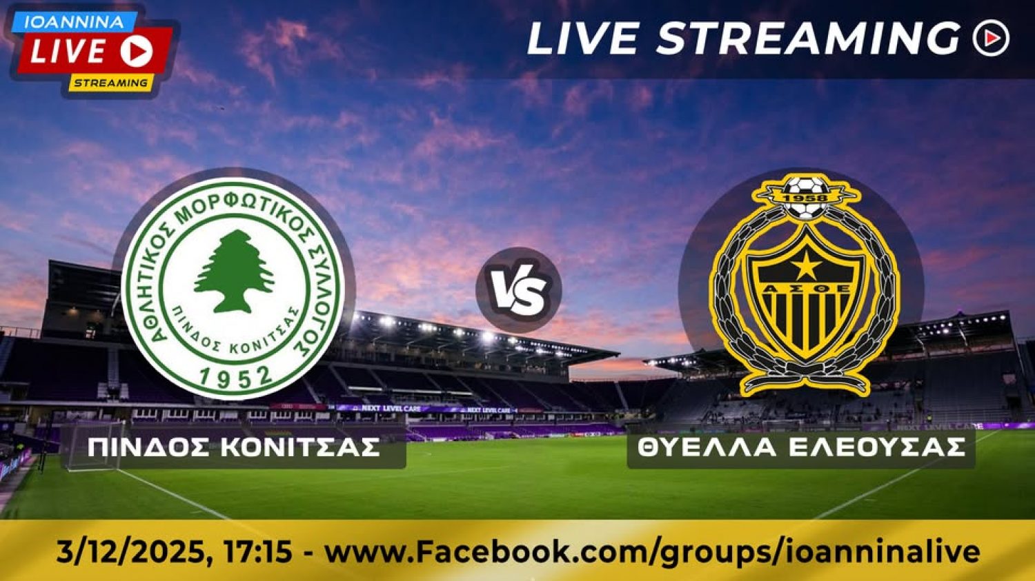 Παρακολουθήστε σε live streaming από το Ioannina Live την αναμέτρηση ανάμεσα στην Πίνδο Κόνιτσας και τη Θύελλα Ελεούσας.