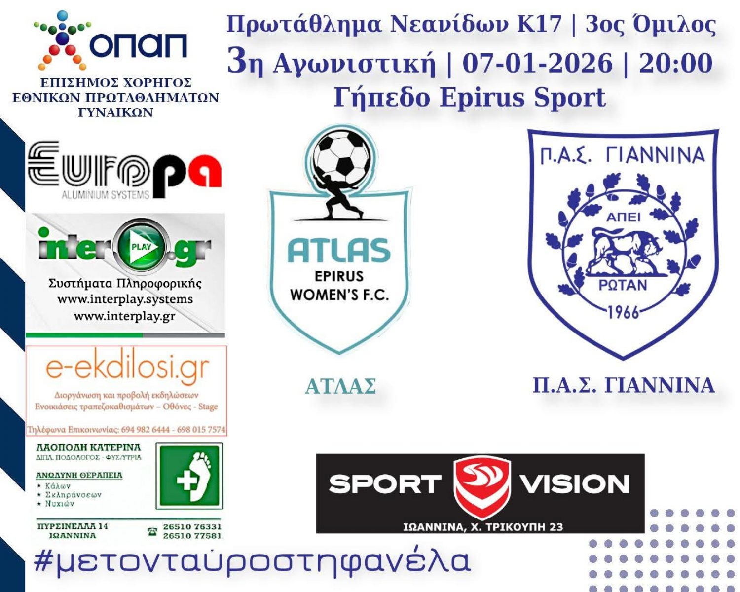 Διαιτητής της αναμέτρησης ο κ. Λεωνίδας Δόσης, με βοηθούς τις κ. κ. Κωνσταντίνα Τζίμα και Αθηνά Γώγου, όλοι της ΕΠΣ Ηπείρου. Είναι ο πρώτος αγώνας για τα κορίτσια με τον Ταύρο στη Φανέλα το 2026. Ο επόμενος αγώνας για την Κ17, εντός έδρας, με τον Αετό Ρίου, θα δοθεί την Κυριακή 25-01, ενώ οι Γυναίκες αγωνίζονται την ερχόμενη Κυριακή, 11-01, εκτός έδρας, με την ενισχυμένη φέτος, ΑΕΚ Τρικάλων.