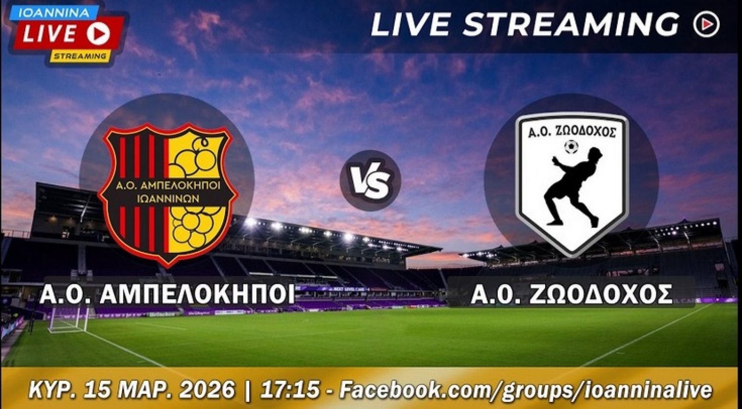 Παρακολουθήστε σε live streaming την αναμέτρηση ΑΟ Αμπελόκηποι-ΑΟ Ζωοδόχος, σε μετάδοση του Ioannina Live.
