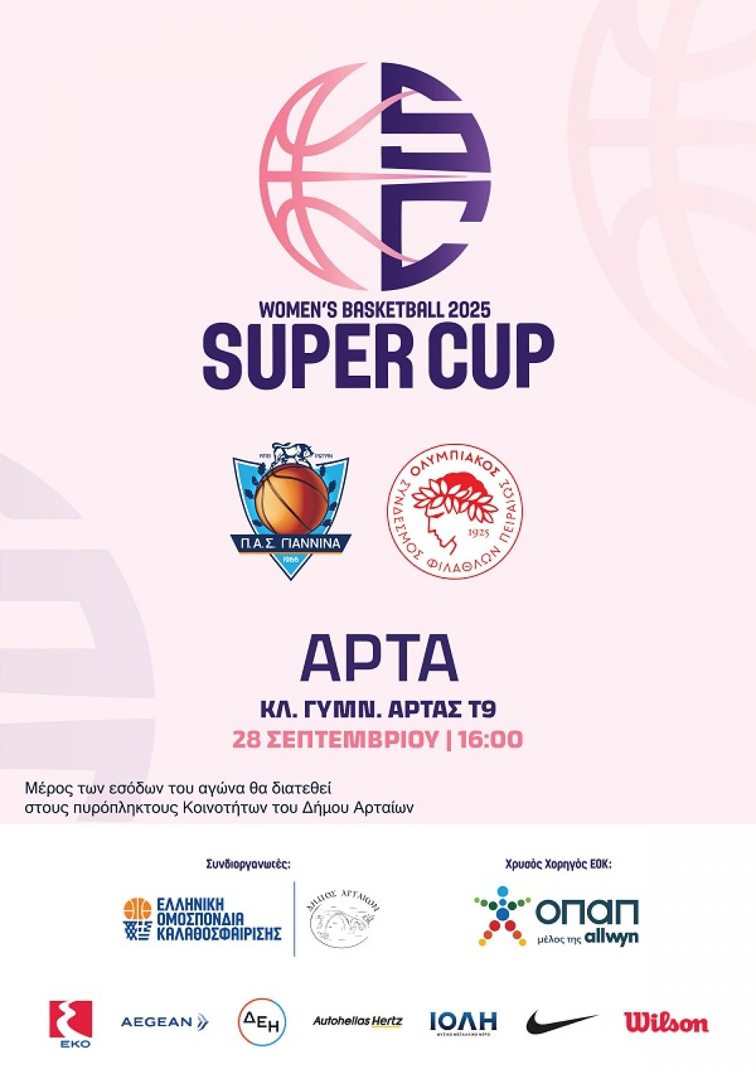Ο Δήμος Αρταίων ενημερώνει ότι ξεκίνησε η διάθεση εισιτηρίων για τον αγώνα Super Cup Μπάσκετ Γυναικών μεταξύ των ομάδων Ολυμπιακός – ΠΑΣ Γιάννενα, που θα διεξαχθεί στην Άρτα, την Κυριακή 28 Σεπτεμβρίου στις 4 το απόγευμα, στο Τ9 Κωστακιών Άρτας.
