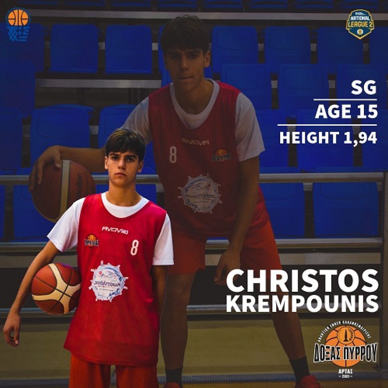 Η Α.Ε. Δόξας Πύρρου Άρτας 2001 – Πηγές Κωστηλάτας πιστή στο πλάνο που έχει αποφασίσει να υπηρετεί, περί ανάδειξης νέων αθλητών από τον τόπο μας, ανακοινώνει τη συμμετοχή στη φετινή ανδρική ομάδα του Χρήστου Κρεμπούνη. Ο Χρήστος είναι 15 ετών (γεννηθείς το 2010), με ύψος 1,94μ, αγωνίζεται ως shooting guard και έχει περάσει από όλα τα τμήματα της ακαδημίας μας.