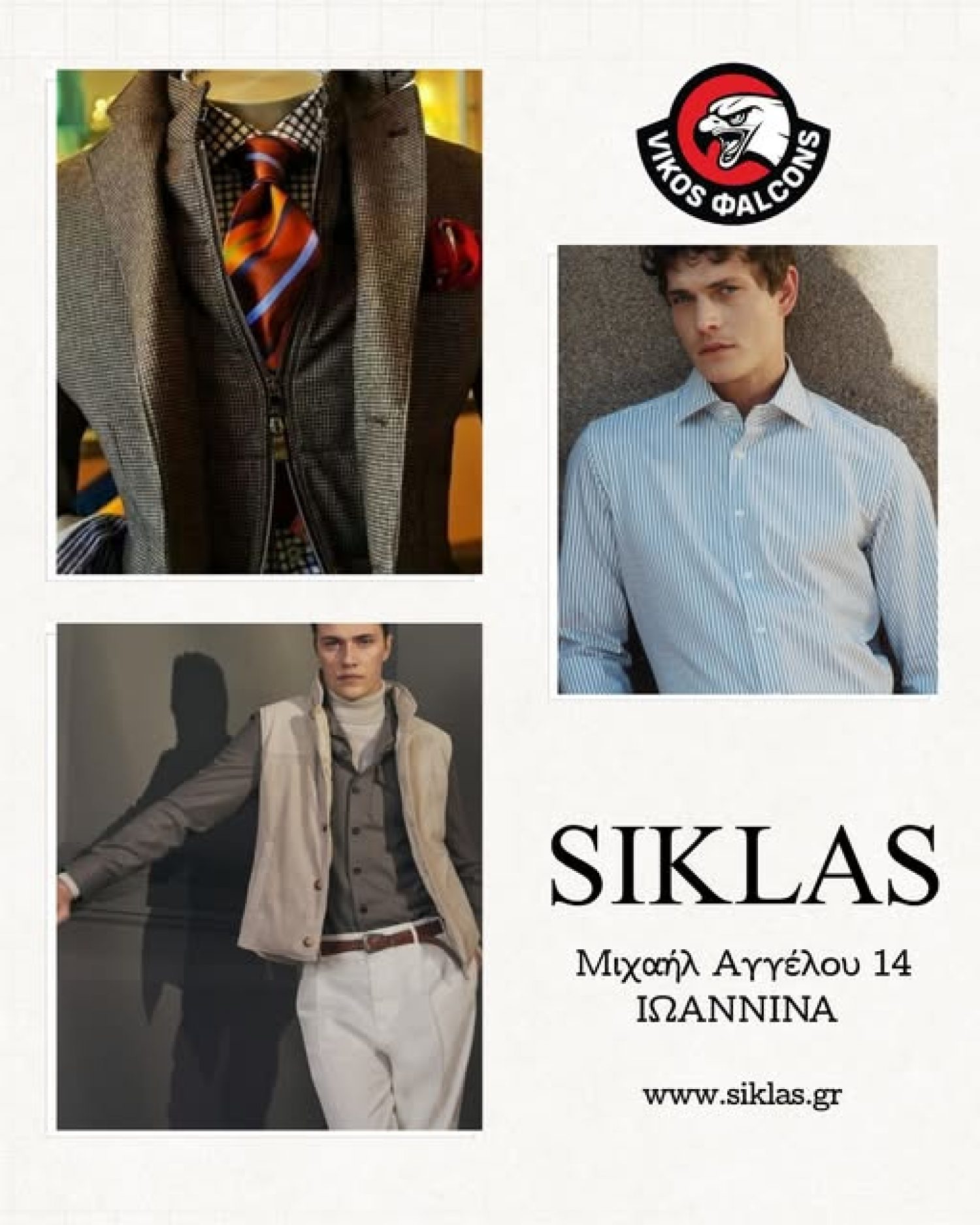 Το κατάστημα SIKLAS βρίσκεται στο κέντρο των Ιωαννίνων (Μιχ.Αγγέλου 14) και αποτελεί ένα από τα πιο γνωστά και κορυφαία καταστήματα της ανδρικής ένδυσης και υπόδησης στα Ιωάννινα. Στο κατάστημα θα βρείτε προτάσεις ανδρικής μόδας από διάσημους σχεδιαστές και κατασκευαστές της Ευρώπης και της Αμερικής. Μέσα στα τόσα πολλά χρόνια λειτουργίας έχει αποκτήσει πιστούς πελάτες γιατί βασικό κριτήριο είναι η άριστη ποιότητα, οι νέες ιδέες και η άψογη εξυπηρέτηση.