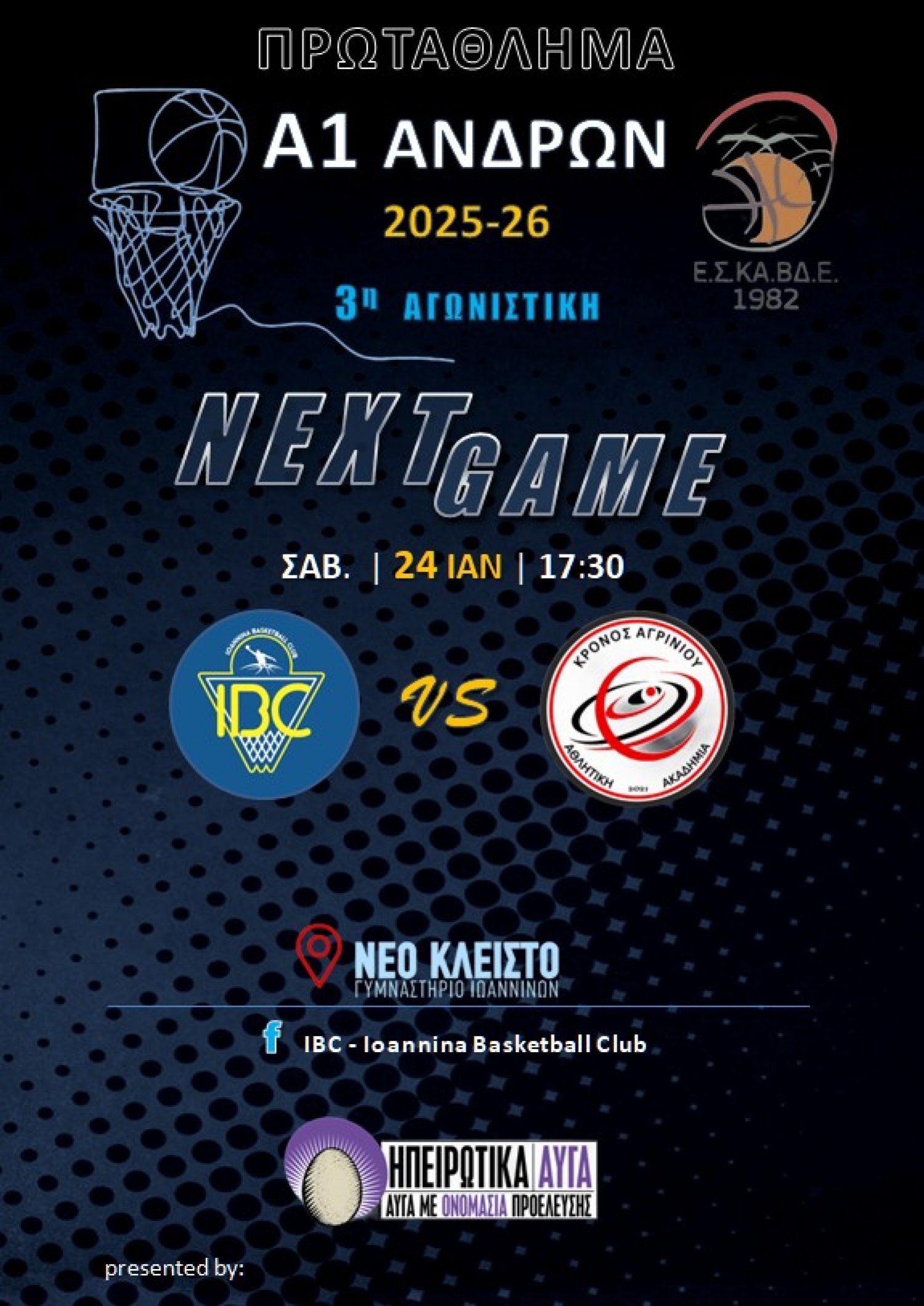 Στο Νέο Κλειστό Γυμναστήριο Ιωαννίνων, το IBC (8-3) κοντράρεται με τον Κρόνο Αγρινίου (5-7).
