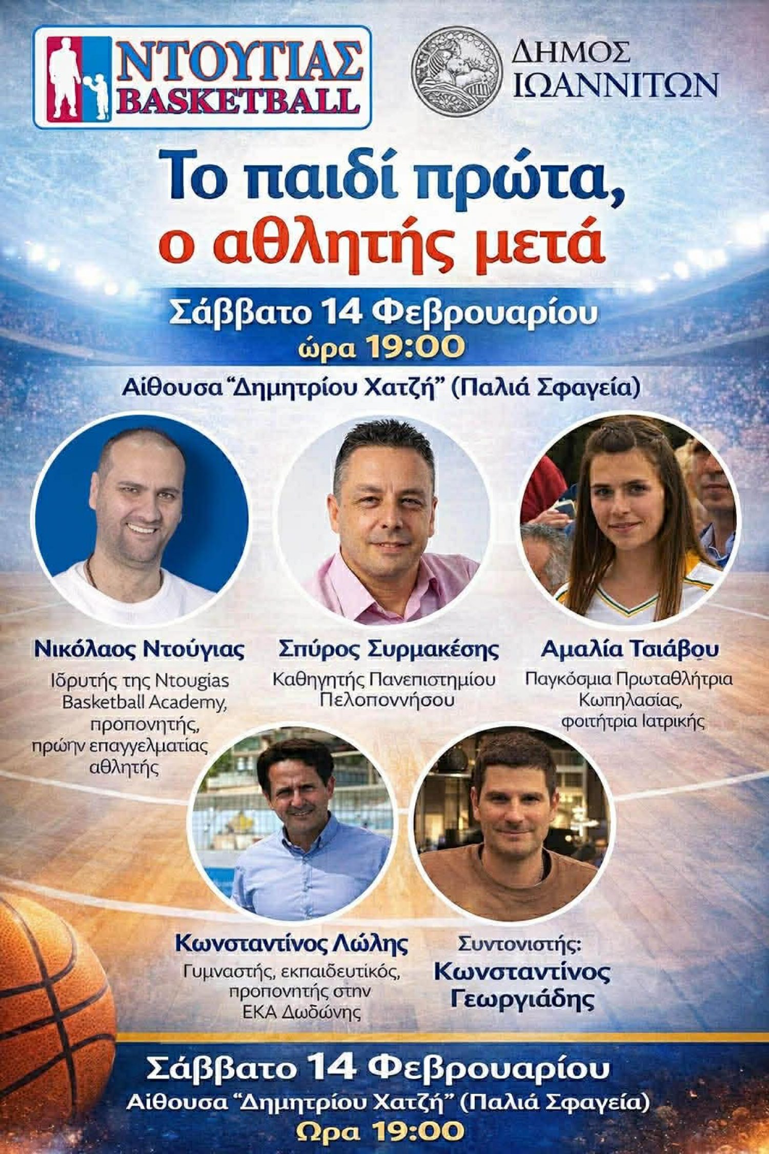 Η εκδήλωση διοργανώνεται από τη Ntougias Basketball, υπό την αιγίδα του Δήμου Ιωαννιτών, και απευθύνεται σε γονείς, προπονητές, εκπαιδευτικούς και σε όλους όσοι ενδιαφέρονται για την υγιή αθλητική ανάπτυξη των παιδιών.