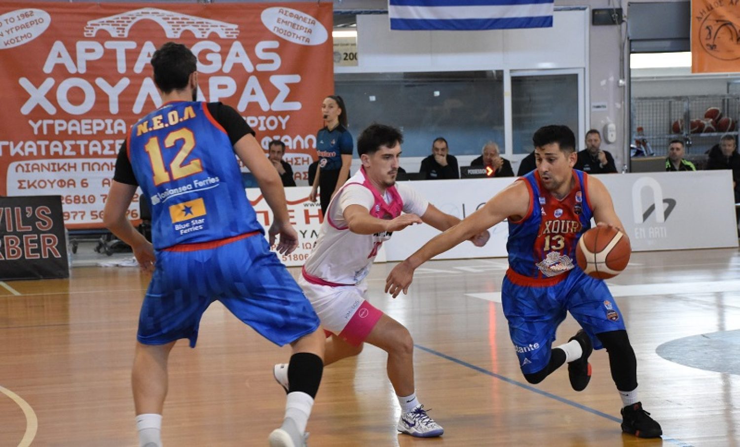 Ο Ματσούκης έγινε ο πρώτος διψήφιος της ομάδας του (11 π.) ισοφαρίζοντας με τρίποντο σε 23-23, με την Α.Ε.Δ.Π. Άρτας στη συνέχεια να κυριαρχεί καταφέρνοντας με 16-4 επιμέρους να ξεφύγει με 36-27, με τον Κώστα Μάνθα να παίρνει κάτι απ' όλους τους παίκτες του. Οι Αρτινοί έφτασαν τις 11 ασίστ για 5 λάθη οικοδομώντας προβάδισμα 14 πόντων (42-28) με τον Ματσούκη να φτάνει τους 16 πόντους και τις 3 ασίστ. Η αντίδραση του ΝΕΟΛ ήρθε καθώς με επιμέρους 2-13 και τους Καραπιπέρη-Μαρούλη "κλειδιά" μείωσε στους 3 (44-41) με το πρώτο μισό να ολοκληρώνεται στο 45-43.