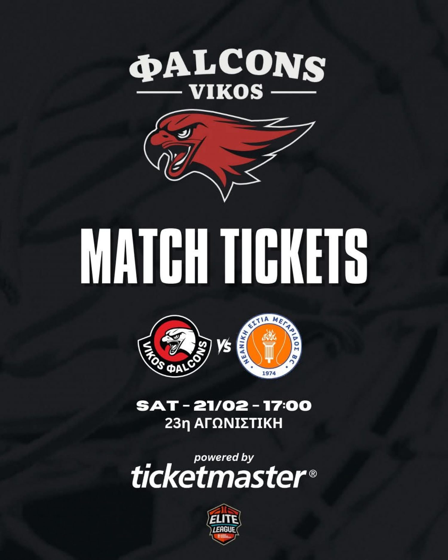 Διαθέσιμα για προπώληση τα εισιτήρια του αγώνα για την 23η αγωνιστική του πρωταθλήματος της Elite League 2025-26 μεταξύ των Vikos Φalcons και της NE Μεγαρίδος, που θα διεξαχθεί το Σάββατο 21 Φεβρουαρίου στις 17:00 στο Κλειστό Γυμναστήριο Ιωαννίνων "Σιδέρης Καραδήμας" Τιμή εισιτηρίου: 10 ευρώ
