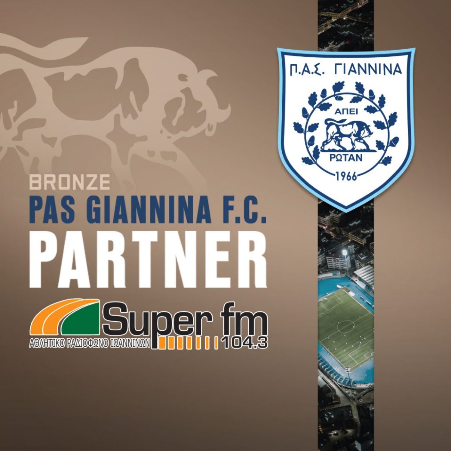 Η ανακοίνωση: H Π.Α.Ε. Π.Α.Σ. ΓΙΑΝΝΙΝΑ 1966 θέλει να ευχαριστήσει τον “SUPER FM” για την συμμετοχή στο πρόγραμμα PARTNER CARD της ομάδας μας, με την αγορά BRONZE κάρτας. Μια κίνηση ουσίας, αλληλεγγύης, περηφάνιας και ΠΑΣολεδικής ευθύνης. Επιχειρήσεις στην Ήπειρο. Επιχειρήσεις στη διασπορά. ΠΑΣολέδες σε κάθε γωνιά του κόσμου. Με κάθε επιχείρηση που συμμετέχει, ο ΠΑΣ κάνει ένα ακόμη βήμα πιο κοντά στην οικονομική του ανάκαμψη και αναγέννηση. Ο SUPER FM 104,3 ιδρύθηκε το 1989 τον Ιανουάριο. Είχε προηγηθεί μία ολόκληρη προεργασία από το 1988 το καλοκαίρι και κατάφερε να κρατηθεί στην πρώτη γραμμή της έγκαιρης και έγκυρης ενημέρωσης, ενώ έδωσε ιδιαίτερη βαρύτητα στην ποιοτική μουσική, ελληνική και ξένη.
