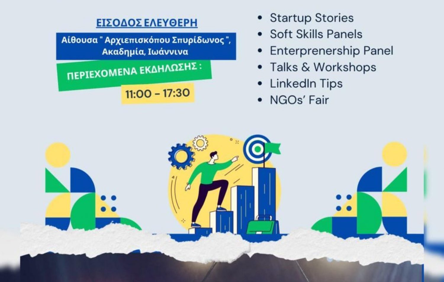 Η ημερίδα «Step into Tomorrow» η οποία θα διεξαχθεί στην αίθουσα Αρχ. Συπρίδωνος από το δημοτικό συμβούλιο νέων, υπόσχεται να αλλάξει τον τρόπο που οι φοιτητές και οι νέοι των Ιωαννίνων βλέπουν την επιχειρηματικότητα και τον εαυτό τους, μέσα από ενδιαφέρουσες ομιλίες, προσωπικές ιστορίες και πρακτικά tips από καταξιωμένους ομιλητές.