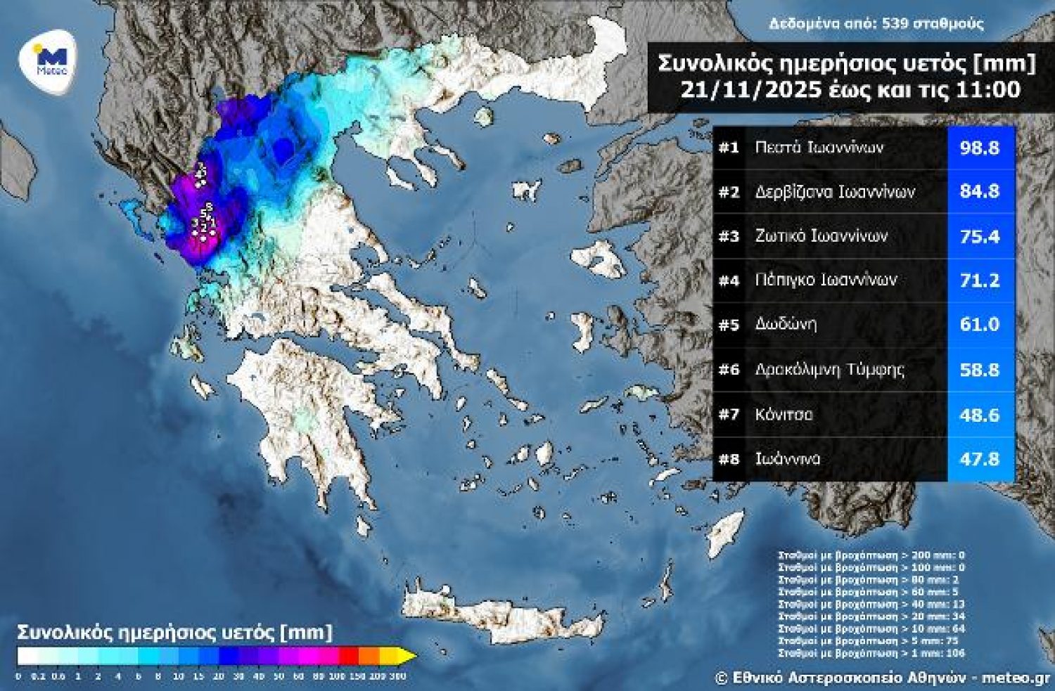 Ο χάρτης της σχετικής εικόνας παρουσιάζει τη κατανομή της αθροιστικής βροχόπτωσης έως τις 11:00 της Παρασκευής 21/11 σύμφωνα με τις καταγραφές του δικτύου του meteo.gr / Εθνικού Αστεροσκοπείου Αθηνών καθώς και τους 8 σταθμούς με τα μεγαλύτερα αθροιστικά ύψη υετού.