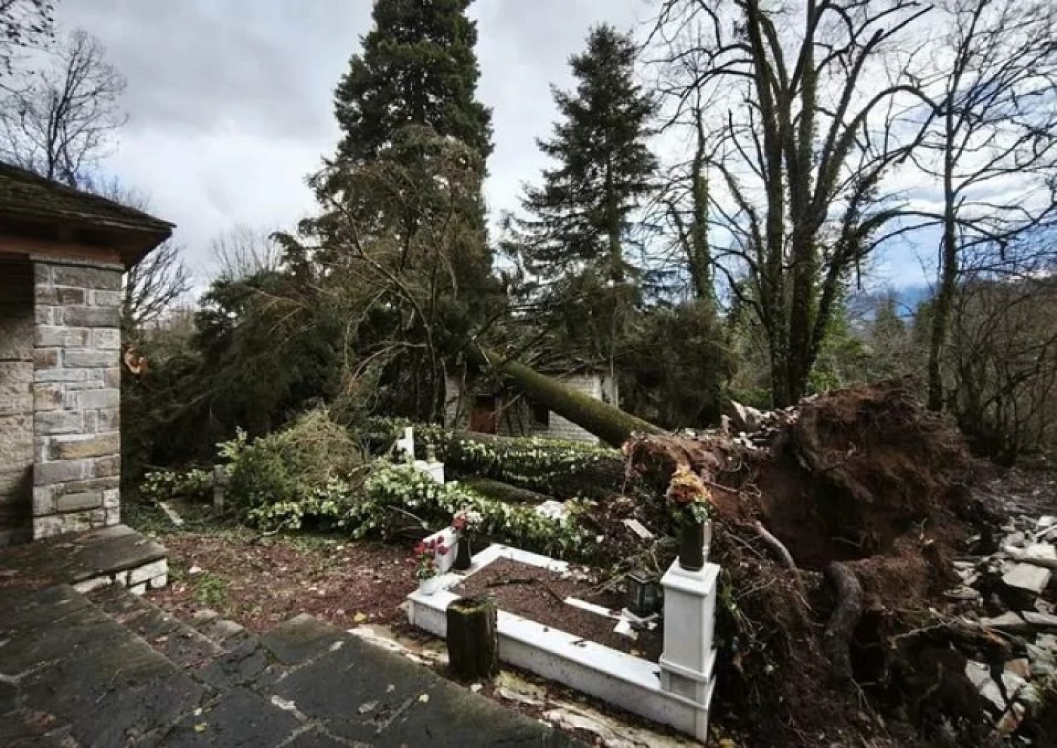Ισχυρές βροχοπτώσεις και δυνατοί άνεμοι ξερίζωσαν μεγάλα κυπαρίσσια, τα οποία κατέπεσαν πάνω σε μνήματα, αφήνοντας πίσω τους εικόνες εκτεταμένης καταστροφής.