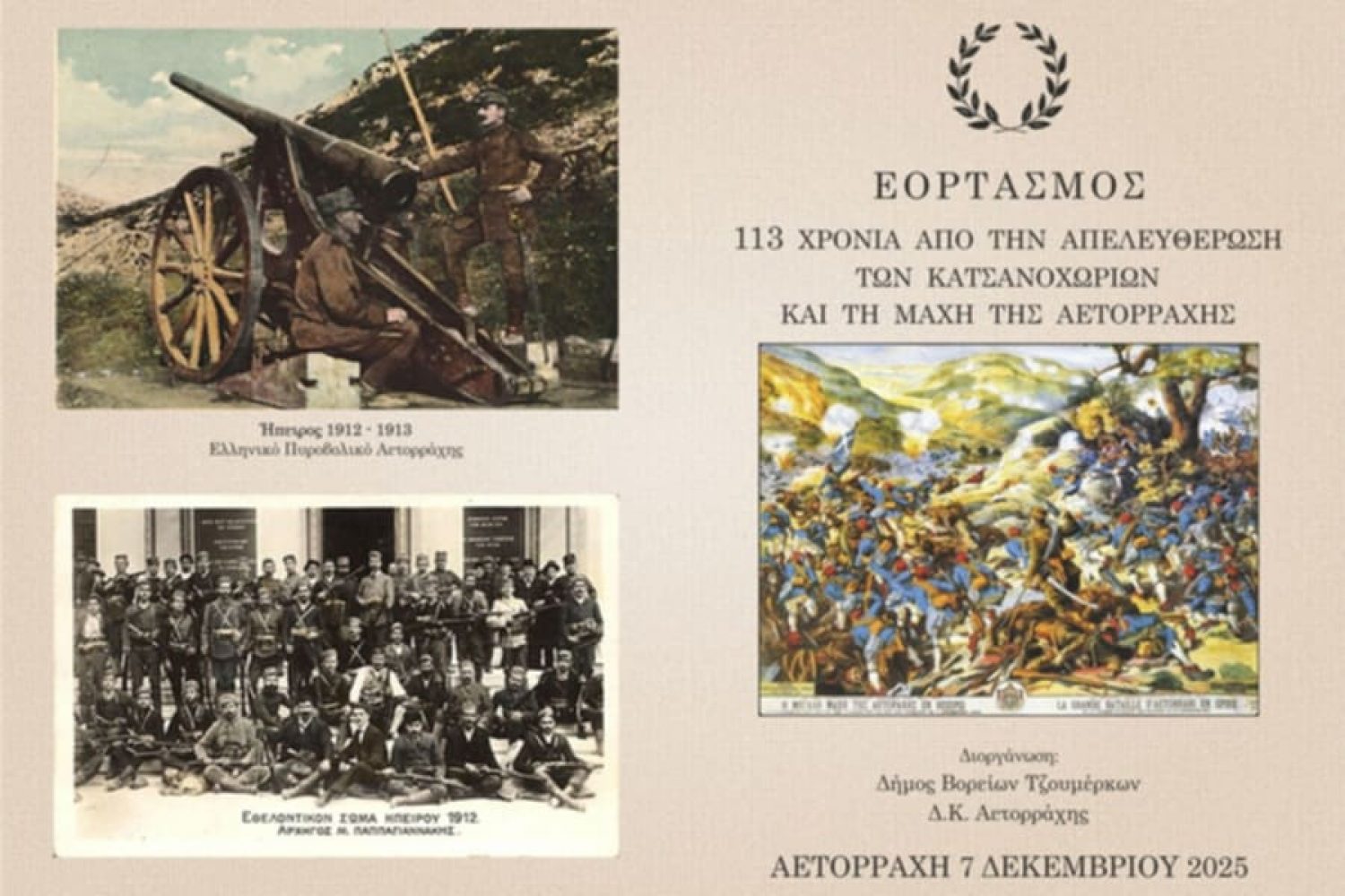113 χρόνια από την απελευθέρωση των Κατσανοχωρίων και τη Μάχη της Αετορράχης γιορτάζει ο Δήμος Βορείων Τζουμέρκων την Κυριακή 7 Δεκεμβρίου, με εκδηλώσεις που συνδιοργανώνει με τη Δημοτική Κοινότητα Αετορράχης