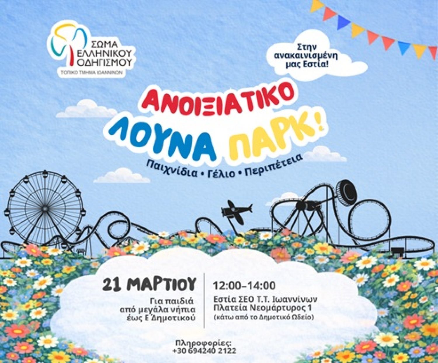 Το Τ.Τ. Ιωαννίνων του Σώματος Ελληνικού Οδηγισμού προσκαλεί τους μικρούς μας φίλους σε ένα χαρούμενο Ανοιξιάτικο Λούνα Παρκ, το Σάββατο 21 Μαρτίου, από τις 12:00 έως τις 14:00, στην ανακαινισμένη Εστία, στην Πλατεία Νεομάρτυρος 1 (κάτω από το Δημοτικό Ωδείο)!
