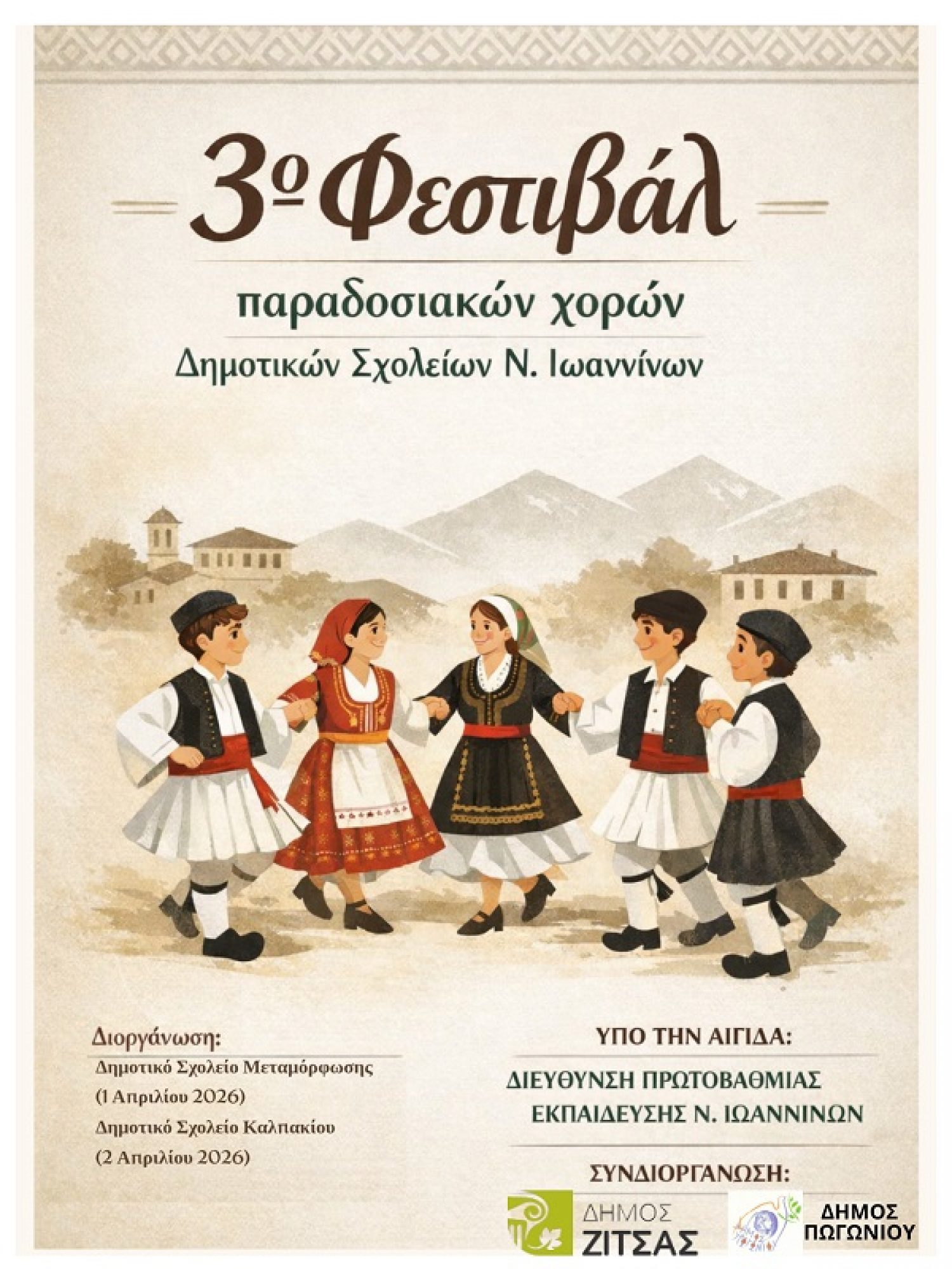 Με οδηγό την αγάπη για τις ρίζες μας και τη θέληση για τη διατήρηση της πολιτιστικής μας ταυτότητας, ο Δήμος Πωγωνίου και το Δημοτικό Σχολείο Καλπακίου συνδιοργανώνουν το 3ο Φεστιβάλ Παραδοσιακών Χορών.