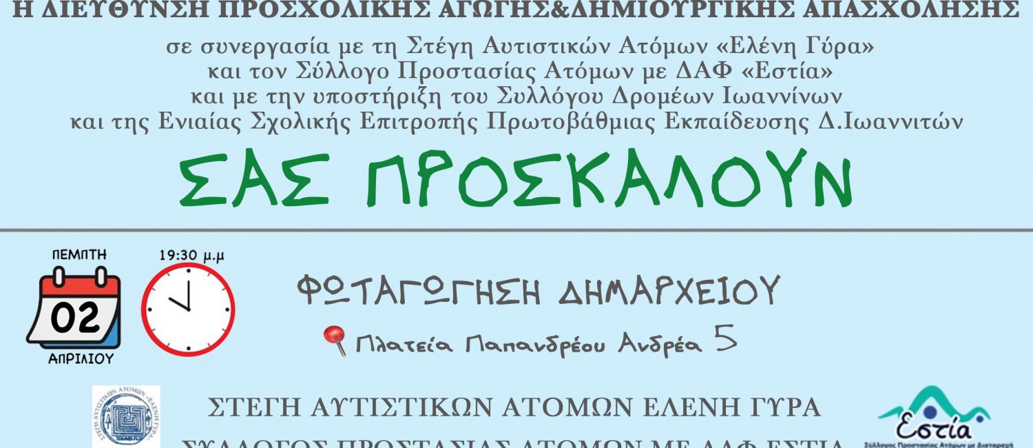 Ο Δήμος Ιωαννιτών, μέσω της Διεύθυνσης Κοινωνικής Πολιτικής & Δημόσιας Υγείας και της Διεύθυνσης Προσχολικής Αγωγής & Δημιουργικής Απασχόλησης, διοργανώνει ένα τριήμερο δράσεων ευαισθητοποίησης με τίτλο «Όλοι μαζί για τον Αυτισμό», με αφορμή την Παγκόσμια Ημέρα Αυτισμού.